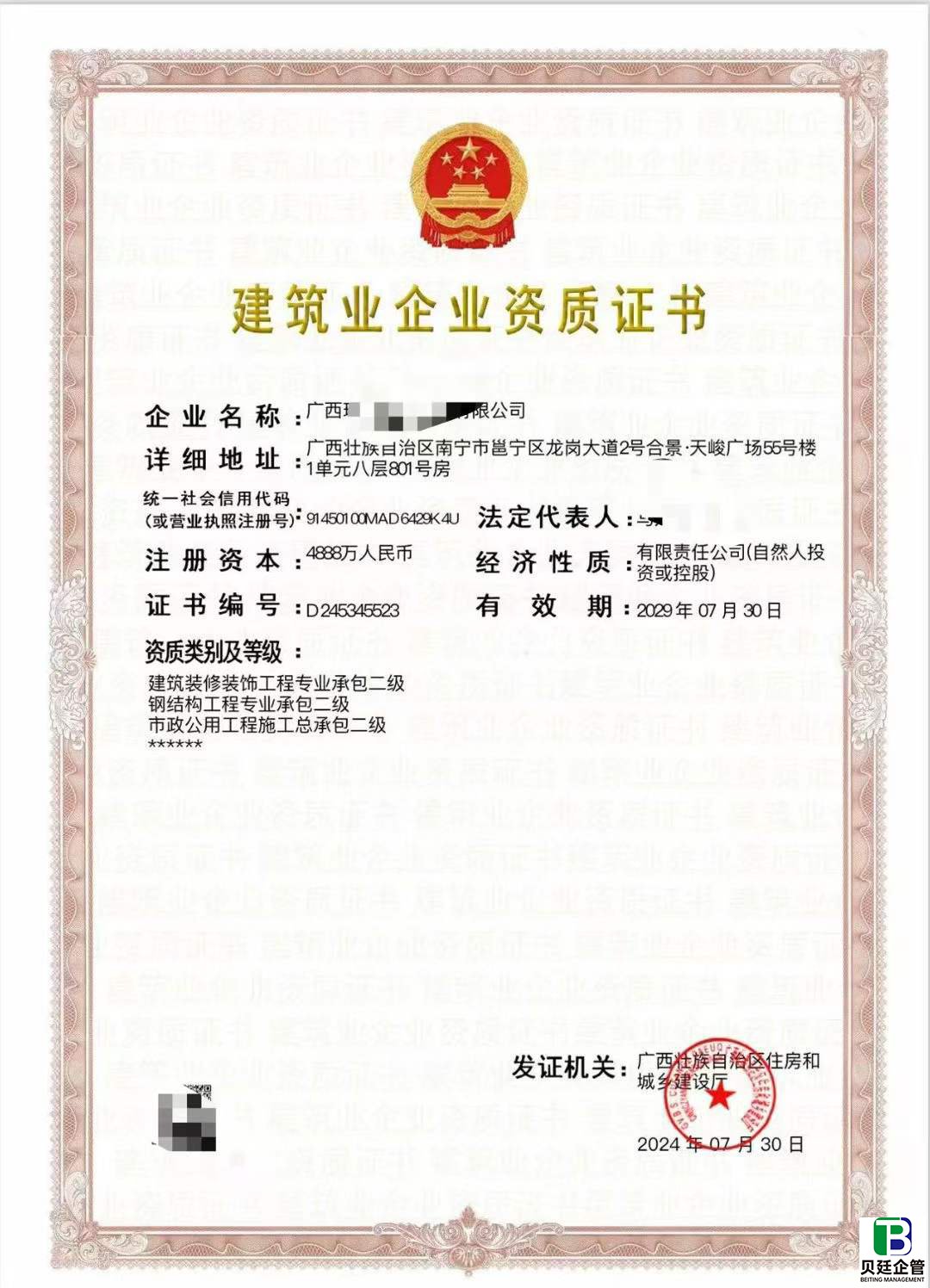 作者:资质大人 | 发布时间:2026-04-07 | 浏览次数:摘要:转让地区: 广西南宁 转让公司: 广西XX建筑工程有限公司 注册资本: 4888万元人民币 经济性质: 有限责任公司(自然人投资或控股) 注册地址: 广西壮族自治区南宁市 转让方式: 整转 资质到期时间: 2029年07月30日 有无安全生产许可证: 有 纳税类型: 小规模(可改) 转让价格: 35万(此价格随政策波动) 该公司包含资质类别及等级: 市政公用工程施工总承包二级; 钢结