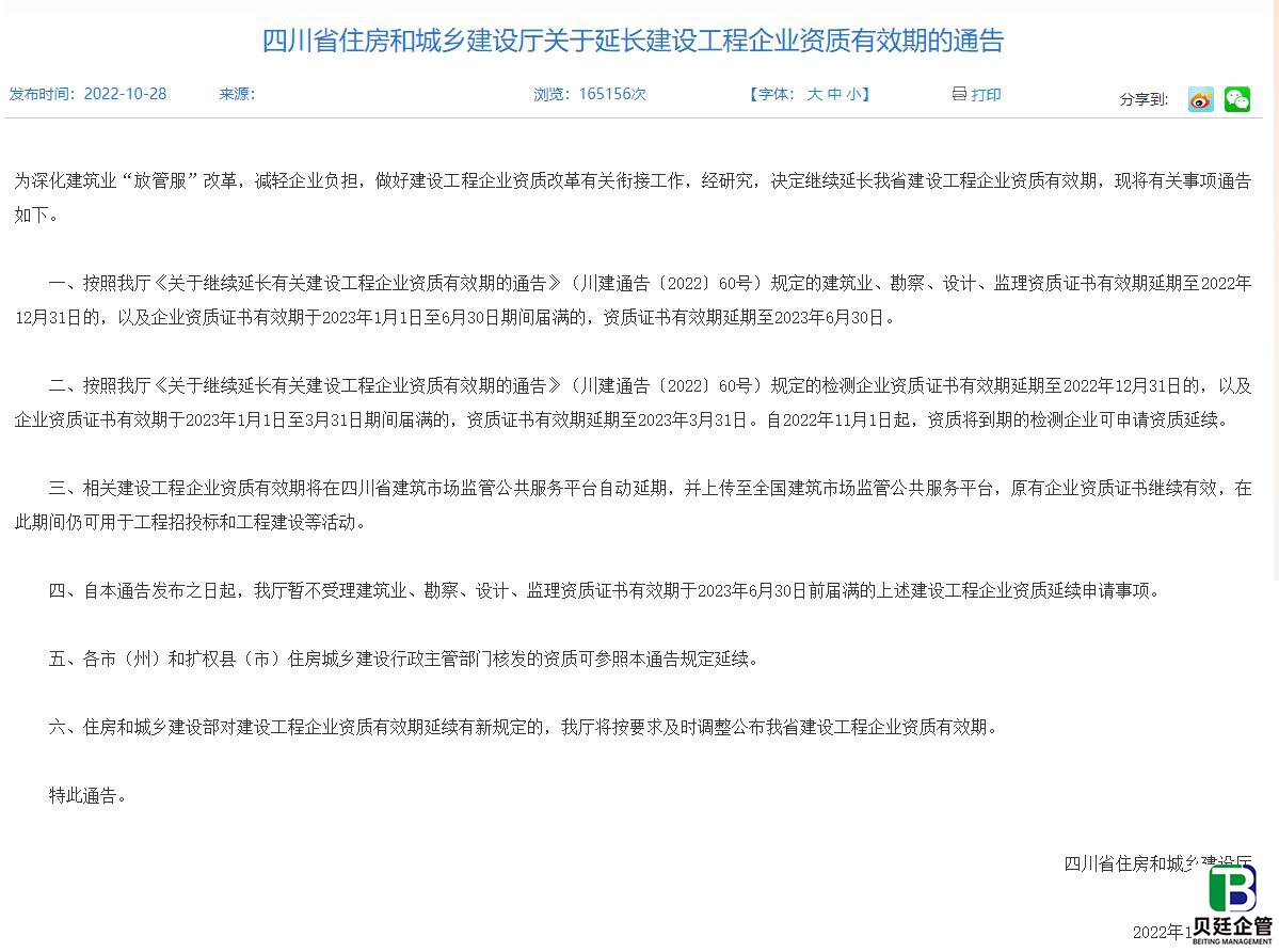 作者:贝廷企管 | 发布时间:2022-10-28 | 浏览次数:摘要:2022年10月28日,四川住建厅发布:建筑业、勘察、设计、监理、检测企业资质证书有效期延期至2022年12月31日的,以及企业资质证书有效期于2023年1月1日至6月30日期间届满的,资质证书有效期延期至2023年6月30日。