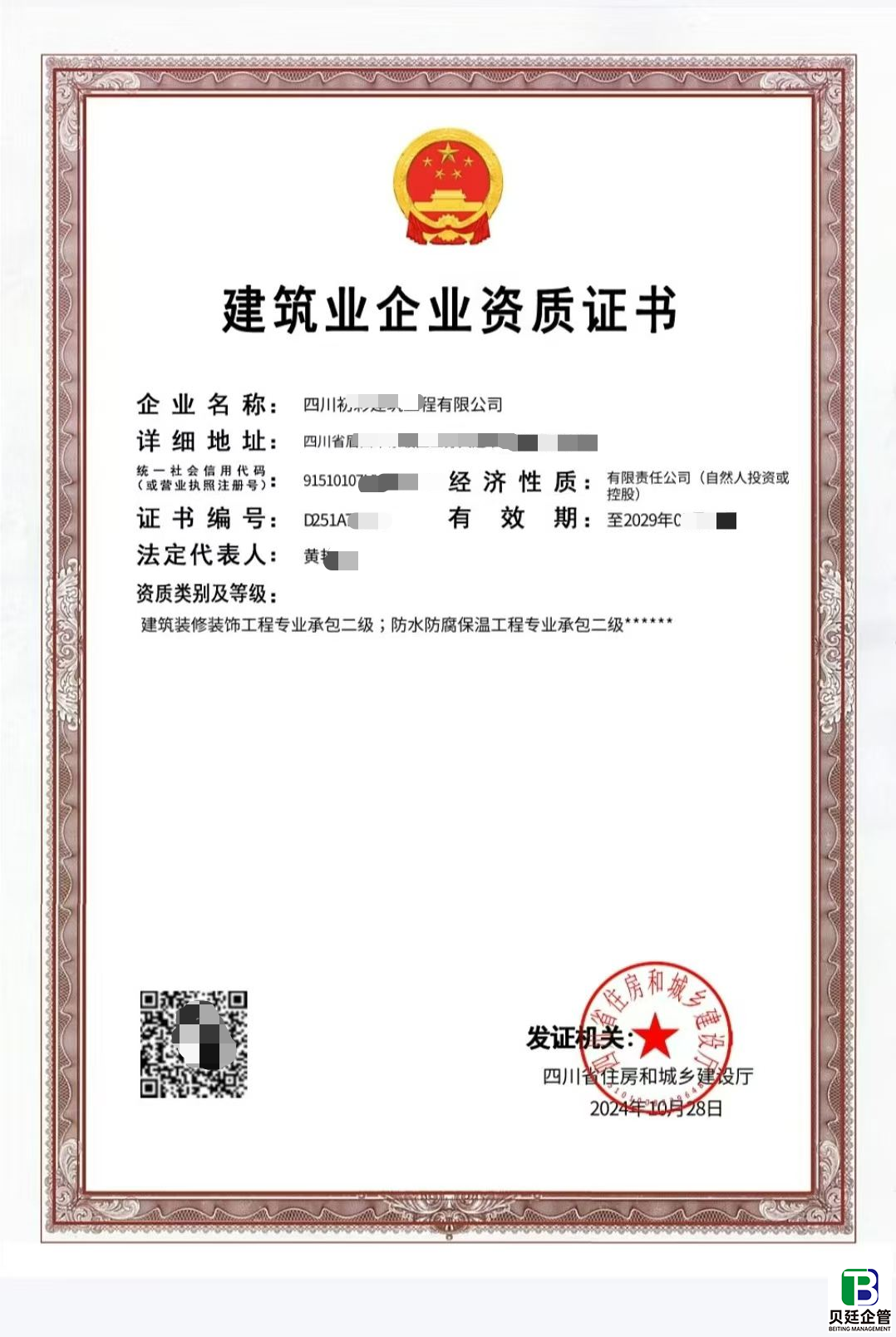包含资质:建筑装修装饰工程专业承包资质贰级;防水防腐保温工程专业承包贰级;